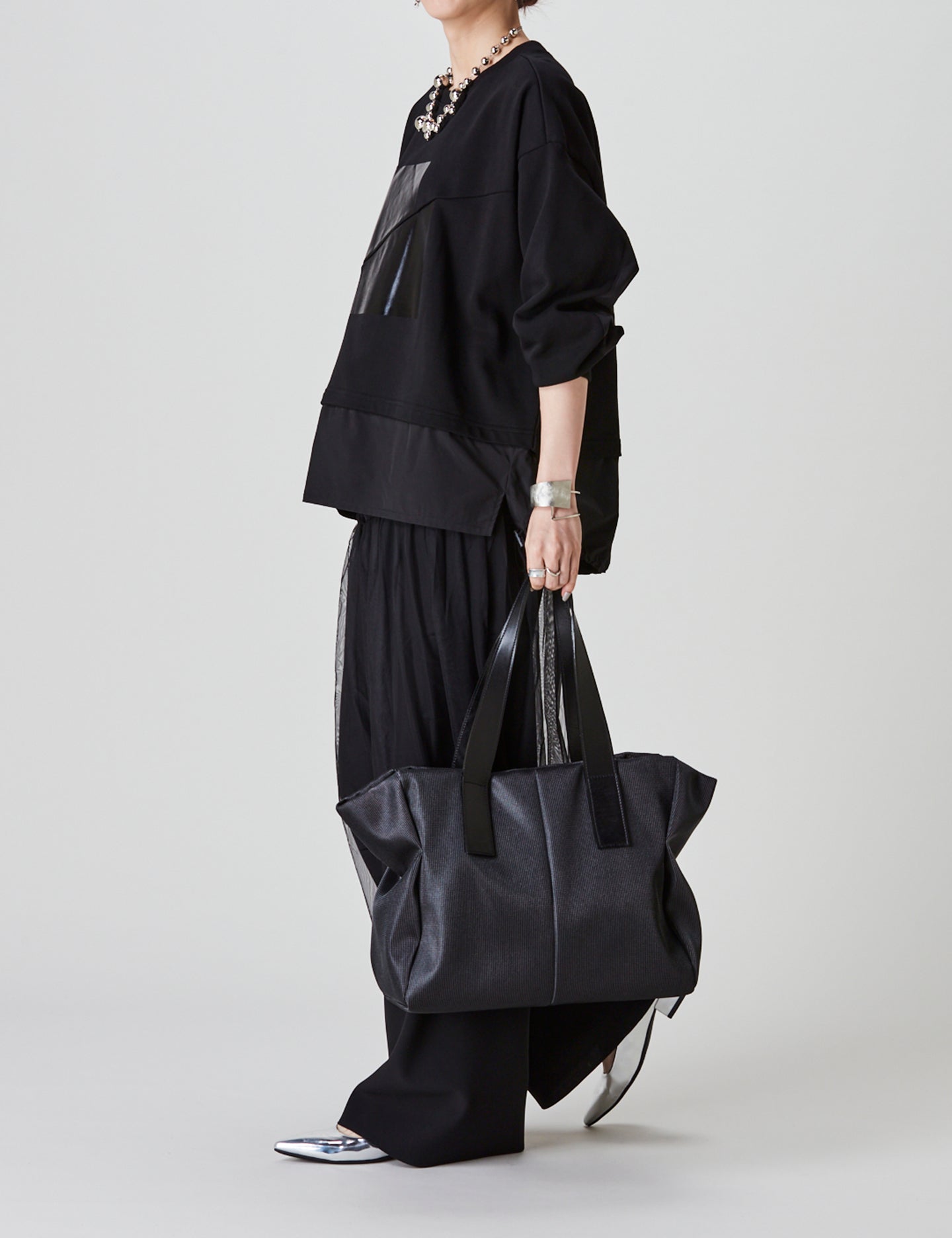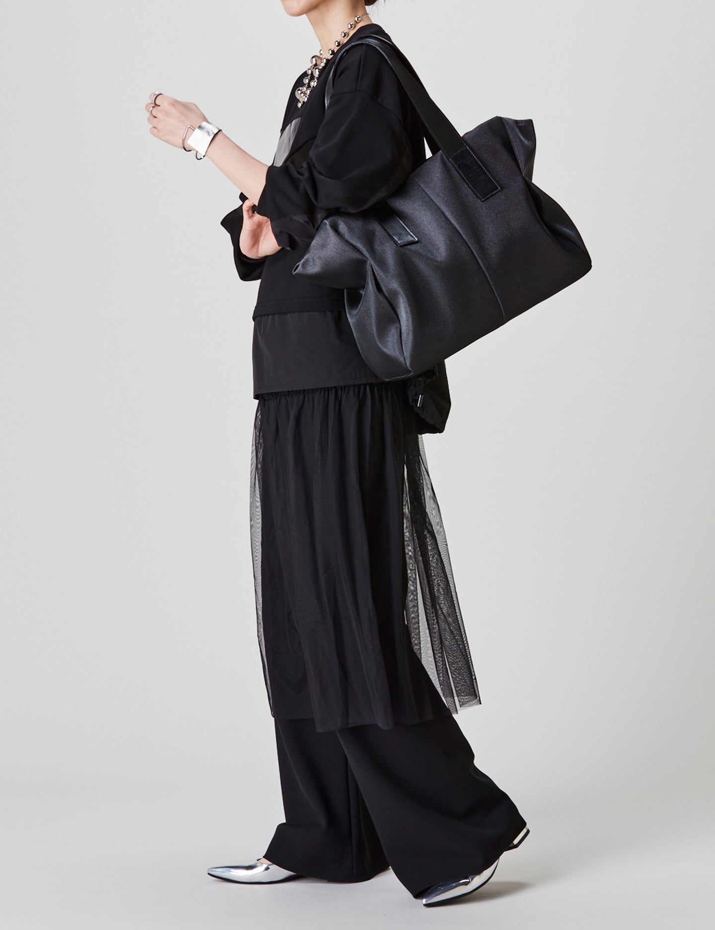 ほどよくシアーな生地と、奥行きのある光沢感が近未来的な空気を醸し出す、ジェンダーレスなコレクション。